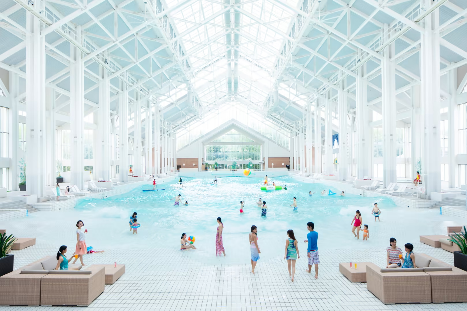 這裡,有日本最大的室内人造海浪游泳池(長80公尺寬30公尺), 不管陰晴雨天,無論四季更迭, 置身其間,一波波浪花就像記憶中的熱帶雨, 為您帶來一陣陣教人舒暢身心的節奏和溫度。 您可以像一尾矯健的人魚,隨波逐浪, 也可以慵懶地在SPA按摩池放鬆四肢, 這裡是所有人的水上樂園。