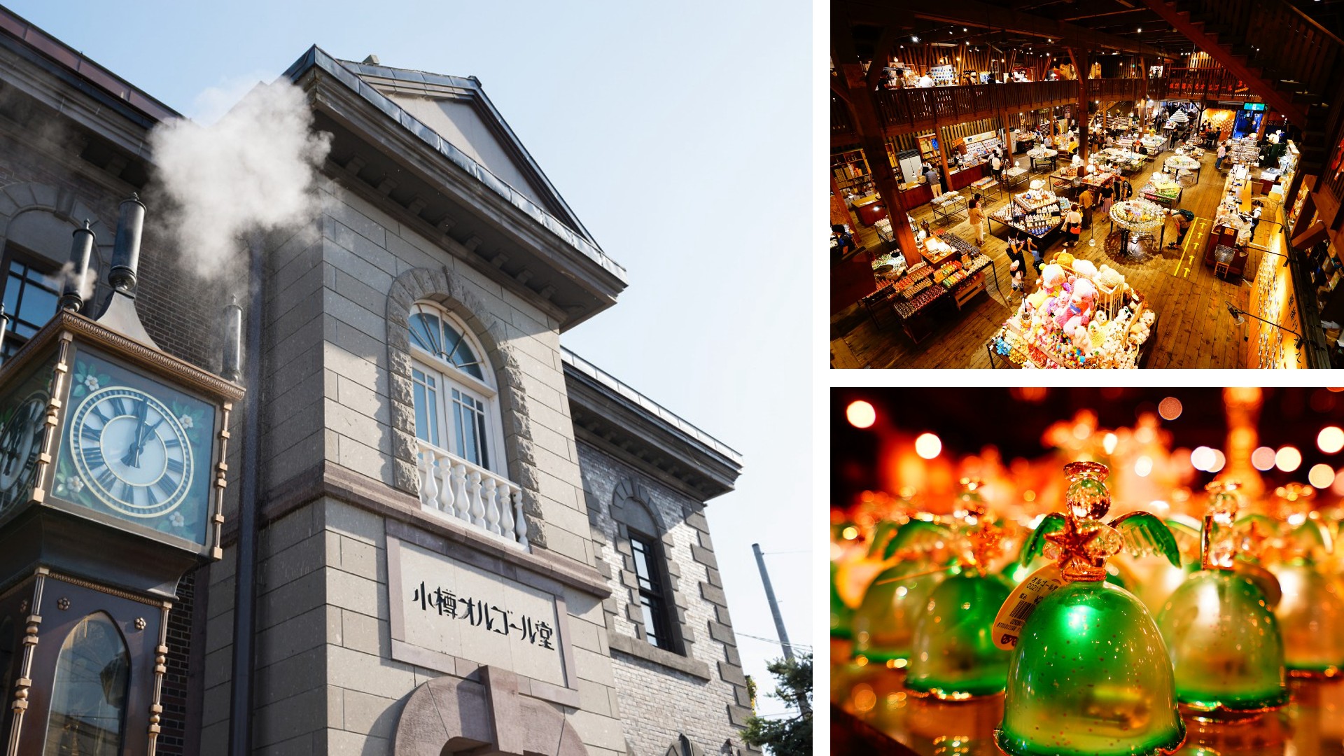 小樽音樂盒堂本館位於小樽堺町通商店街的盡頭,是日本最大規模的音樂盒專賣店。這棟紅磚木骨建築物於 1912 年建成,曾是米穀商人的總公司,現在被登錄為小樽市指定歷史建築物,充滿懷舊的歐式古典氛圍。其最著名的特點是門口矗立著一座高達 5.5 公尺、重 1.5 噸的蒸汽鐘,這是由加拿大鐘錶工匠製作,每隔 15 分鐘會以蒸汽發出五個音階的旋律,成為遊客必訪的打卡地標。館內收藏並展示販售來自世界各地多達 3,000 多種、超過 25,000 件精緻的音樂盒。